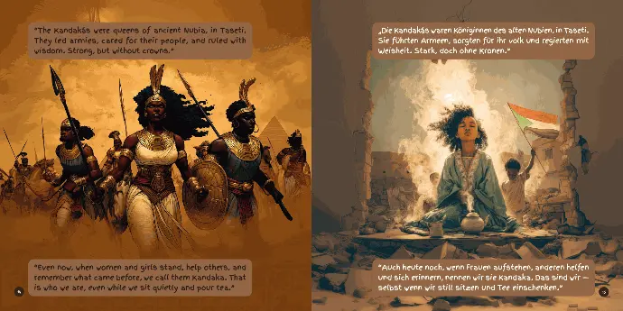 The interlude on Queen Amanirenas reframes heroism for young readers. Known as the Kandaka who led Nubia against Rome, Amanirenas becomes a moral compass — teaching Salma that leadership is not volume but rhythm, not dominance but grace.
