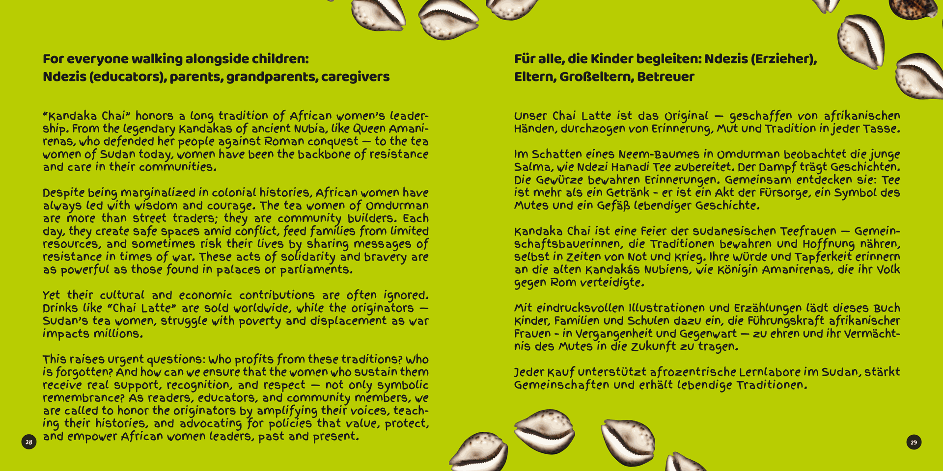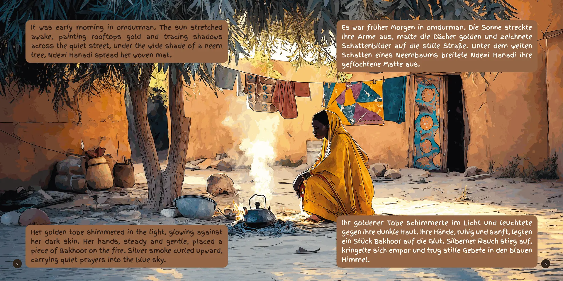 The story echoes the resilience of Sudan’s tea ladies, whose stalls often become places of refuge, news, and solidarity. Through Hanadi, children learn that gentleness is not weakness but a form of strength that resists chaos without noise.